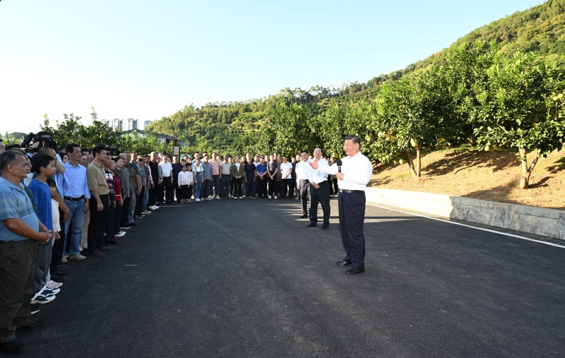 11月7日至8日,中共中央总书记、国家主席、中央军委主席习近平在广东考察。这是7日下午,习近平在梅州市梅县区雁洋镇南福金柚种植基地考察时,同村民们亲切交流。 新华社记者 谢环驰 摄